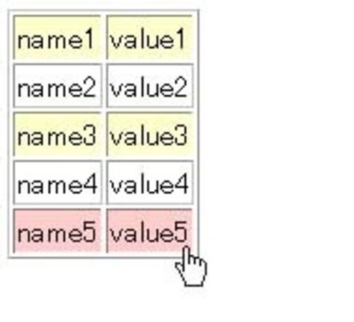 こんな感じに偶数/奇数行で色を変えたり、マウスのフォーカスがある行に色をつける方法。 HTMLはこんなん。 <table id="result" border="1"> <tr><td>name1</td><td>value1</td></tr> <tr><td>name2</td><td>value2</td></tr> <tr><td>name3</td><td>value3</td></tr> <tr><td>name4</td><td>value4</td></tr> <tr><td>name5</td><td>value5</td></tr> </table> 色はCSSで決めた方が…